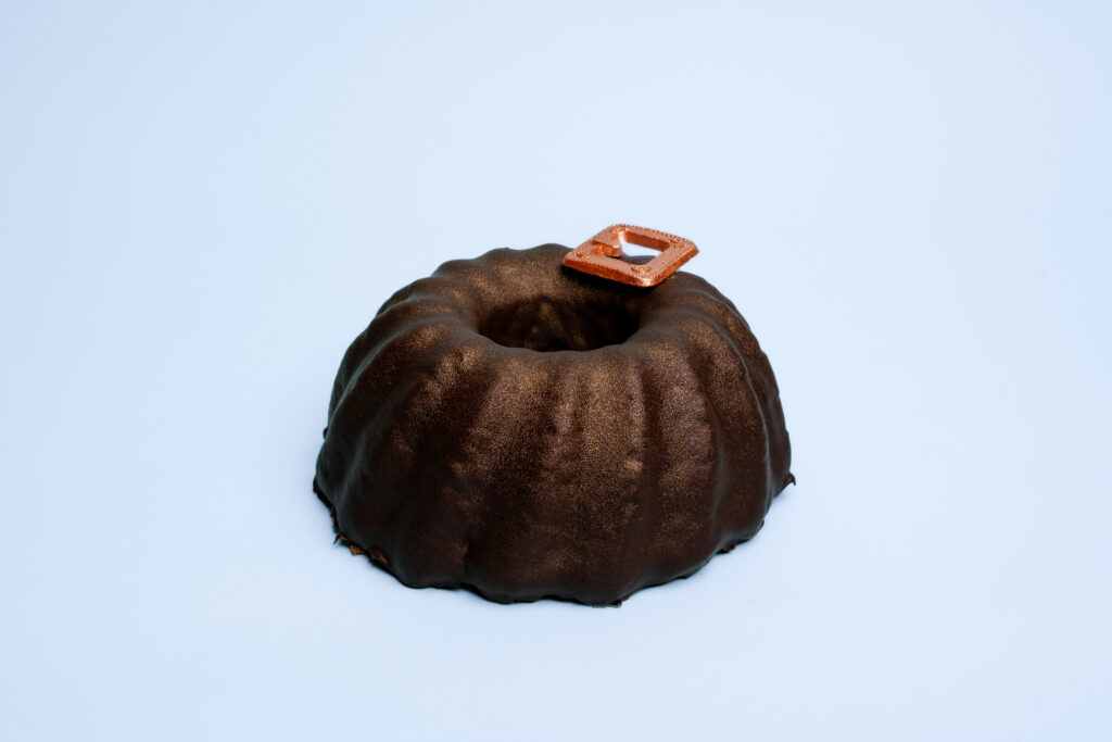 Een rijk gevulde tulband, geglaceerd met pure chocolade en feestelijke decoratie.